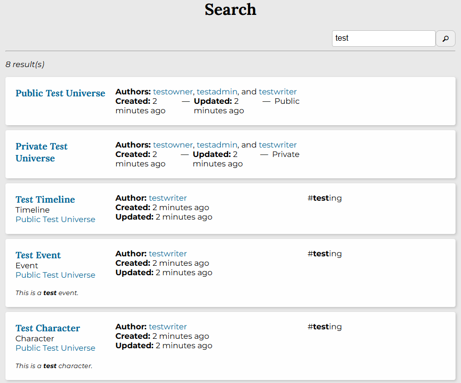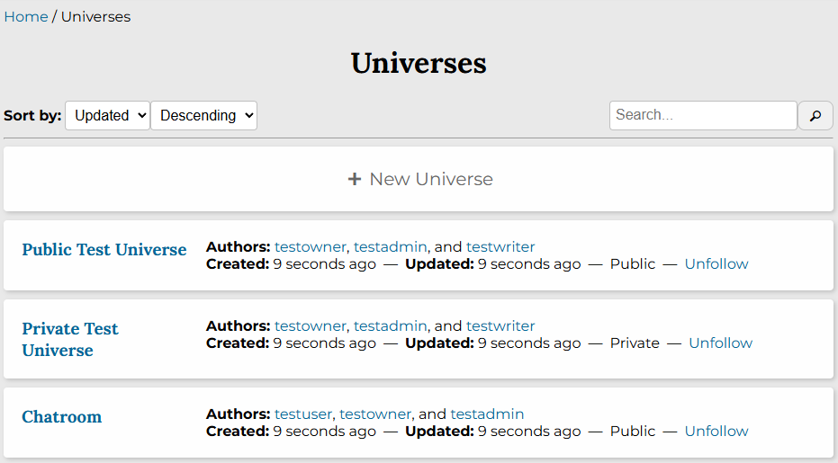 Lists across the site are now more consistent and sortable. Items and universes default to sorting by most recently updated, instead of least recently created. Universes are grouped by your relationship to them — universes you follow or are an author of are grouped first. We’ve also added search bars to item lists, universe lists, and user/thread sections within each universe.